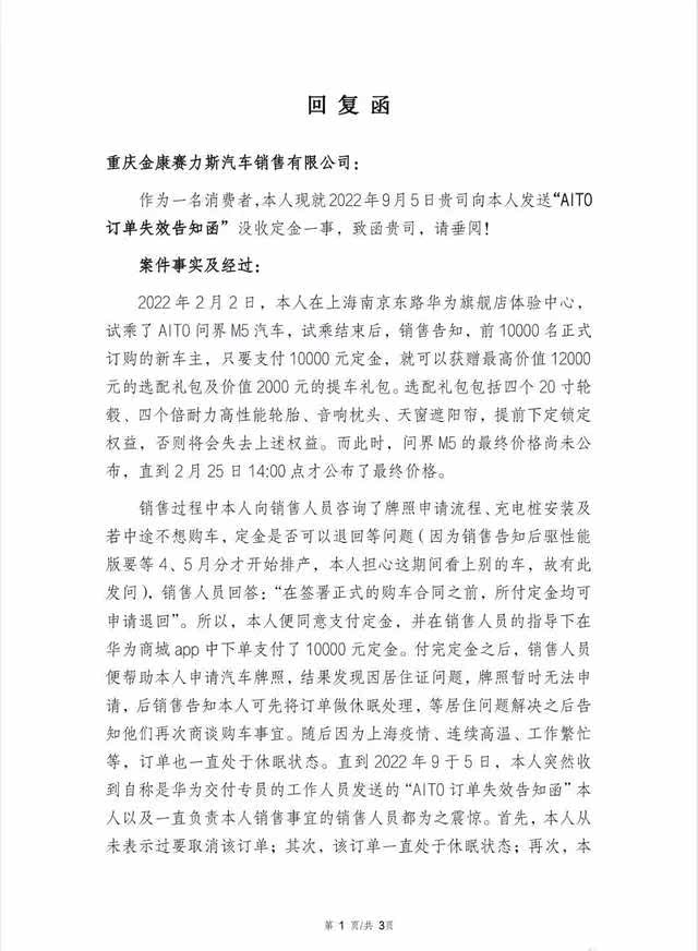 近日,一消费者在某社交平台发文称,其2022年2月在上海某华为旗舰店体验中心,在试乘完问界M5后,交付10000元定金。但是因上海疫情防控、无法上牌、持续高温和工作繁忙等因素影响,曾告知门店销售提车,订单一直处于休眠状态。9月5日,该消费者收到《AITO订单失效告知函》。