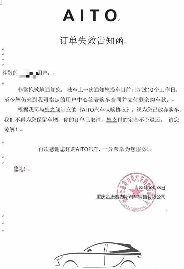 该《告知函》指出,距离上一次通知该消费者提车已超过10个工作日,至今该消费者还未到赛里斯指定的用户中心签署购车合同并支付剩余车款。根据《AITO汽车认购协议》,认为该消费者已放弃购车,不再为其保留车辆,订单已取消且支付的订单不予退还。