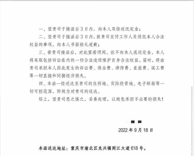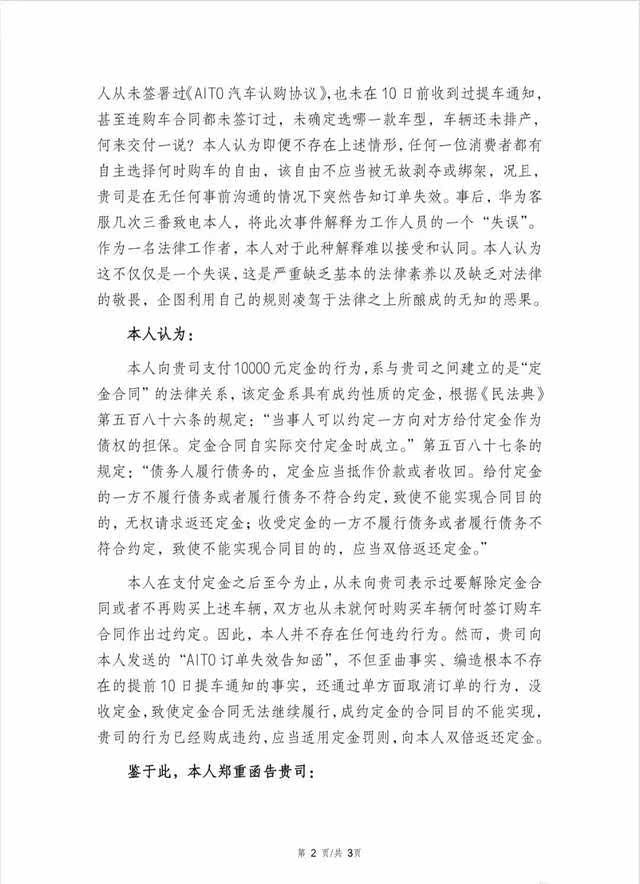 按照惯例来说,该消费者的定金不应该退。但是该消费者认为,自其支付定金至今,从未表示过解除合同或不购买车辆,双方也从未就何时签订购车合同而作出过约定,因此该消费者认为其并不存在违约行为。其指控,是问界方面歪曲编造事实、单方面取消订单并没收定金,致使定金合同无法继续履行。因此,该消费者向问界方面提出两点诉求:一、双倍返还定金;二、就问界交付工作人员侵犯其权益事项,向其书面赔礼道歉。