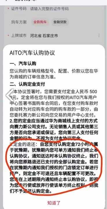 按照《AITO汽车认购协议》认购协议,下定后有72小时随时退订的犹豫期,消费者可以单方面通过销售终止认购协议,同时送达时认购协议即可终止,全部认购将原路返回。若由于其内锁定订单进行排产,则定金不退且车辆配置不可更改。但是这72小时的犹豫期本应是给消费者的“后悔药”,却成了部分销售门店可以钻的空子;协议内未对退款时间做出明确规定,则成了消费者退款路上的绊脚石。