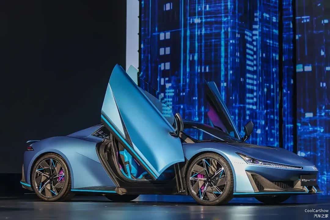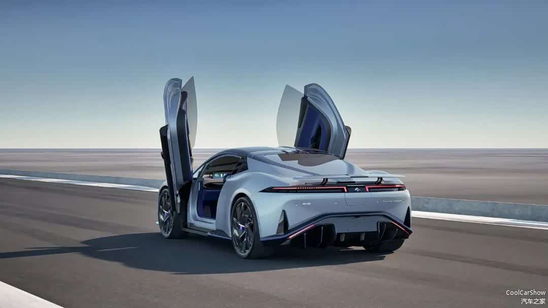 侧面视觉可以看到Hyper SSR流线且简洁的车身线条。最大的亮点是采用了蝶翼式车门,开门状态下相当酷炫。