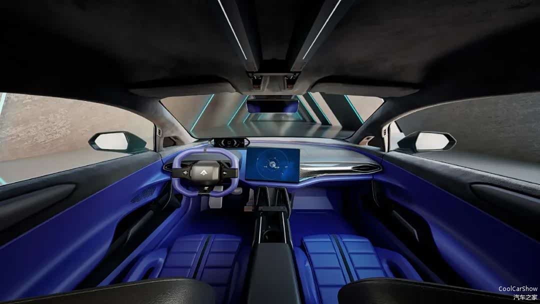 Hyper SSR内饰使用大量的Alcantara材质包裹,中控台采用对称式布局。驾驶位前方是一个长条形的8.8英寸液晶显示屏仪表盘,搭配一个六边形的三辐方向盘;中央配备了内嵌式的14.6英寸多媒体显示屏,微微向驾驶位倾斜。另外,中控台两侧还配有大片的碳纤维饰板。