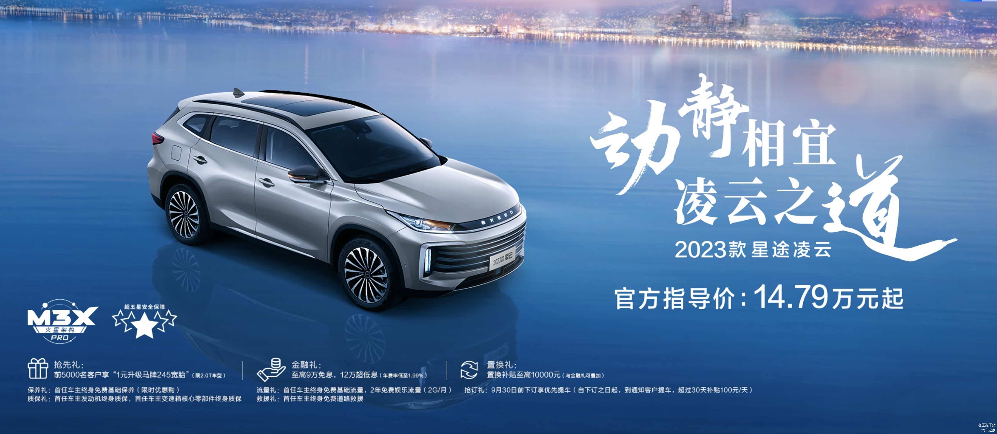 2023款星途凌云自9月6日上市以来,受到了大量关注,14.79-18.29万元共五款车型,包含了300T和400T两款动力总成。同时,还推出了凌云S CCPC冠军版,共两款车型。更加令人意想不到的是,厂商还给出了相当丰富的购车福利,例如:前5000名客户享1元升级245宽胎,金融免息及低息政策,至高1万元置换补贴,首任车主终身免费基础保养,首任车主发动机终身质保,变速箱核心零部件终身质保等福利,可谓诚意满满。