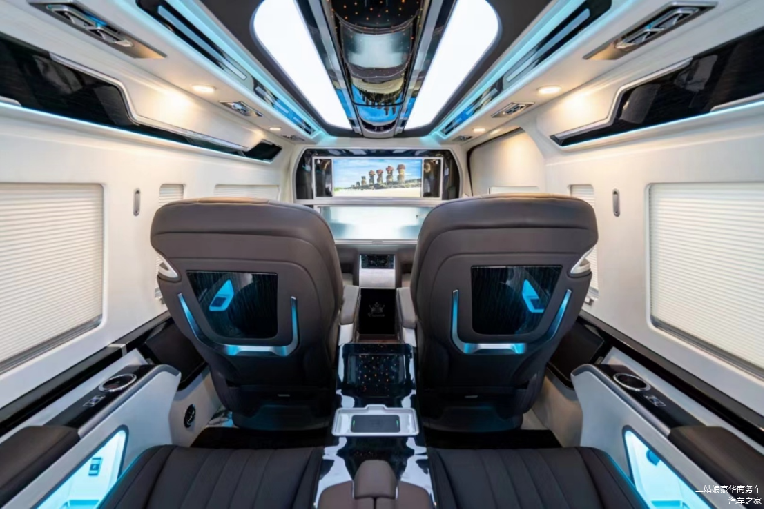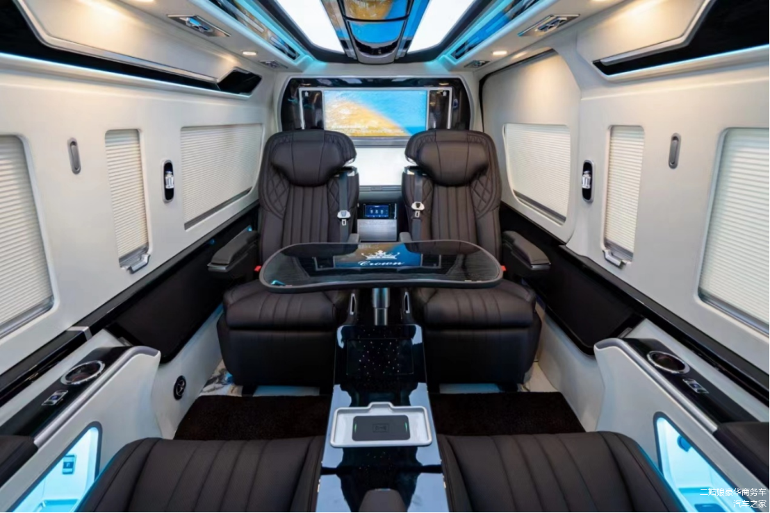 把中排座椅旋转过来,支上小桌板变身移动会客厅,面对面喝茶、就餐、棋牌娱乐、签署协议,想怎样就怎样。顶部灯具造型层次感和科技感非常的优秀,照明灯、氛围灯、星空灯、阅读灯都安排上了,甚至为了方便乘客夜间调节出风口还定制了出风口灯。