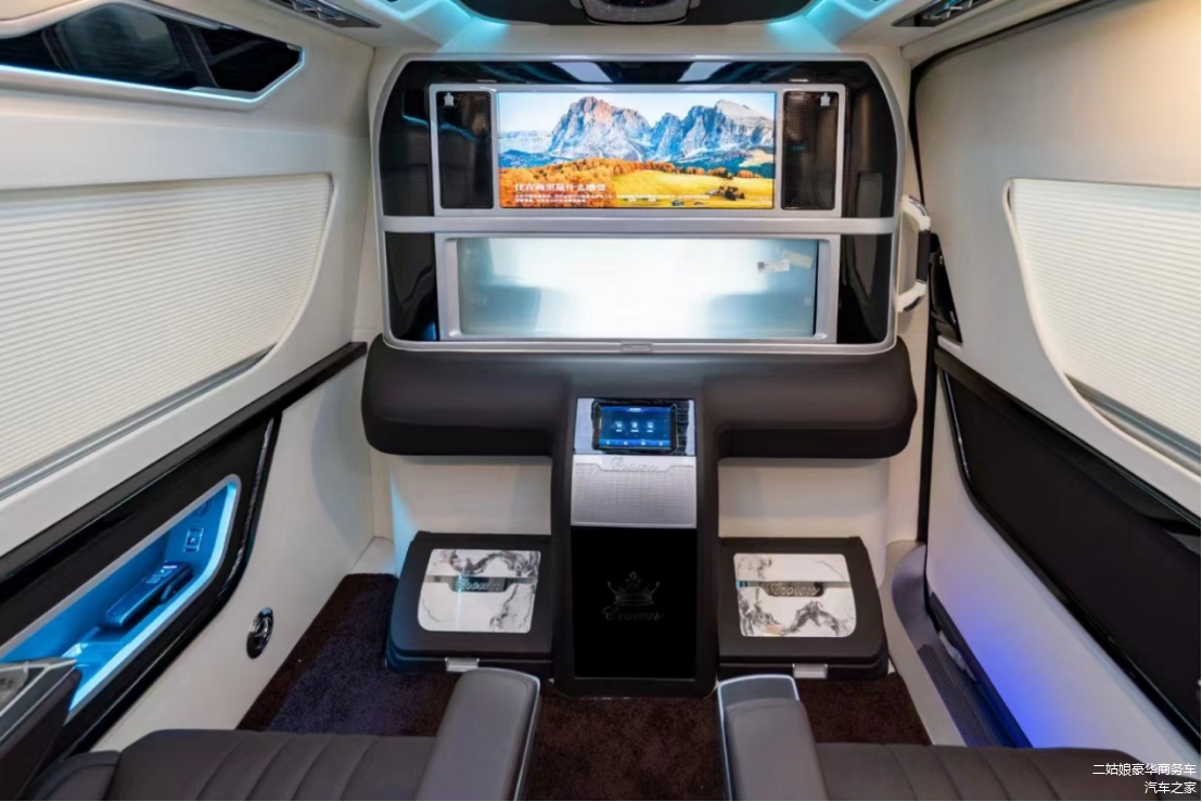 前脸使用的埃尔法设计语言风格的镀铬包围套件,配上炯炯有神的LED透镜大灯显得霸气威武。B柱位置造型和埃尔法几乎一致,还贴有皇冠LOGO凸显与在不同的尊贵。后舱采用大面积的黑色隐私玻璃既保护的乘客的隐私又起到隔热防晒的作用,在左侧还设有一个可滑动开启的窗户方便后舱通风换气。侧裙位置加装了镀铬装饰,更加具有层次感;17寸的双色花瓣状的铝合金轮毂也显得美观别致。