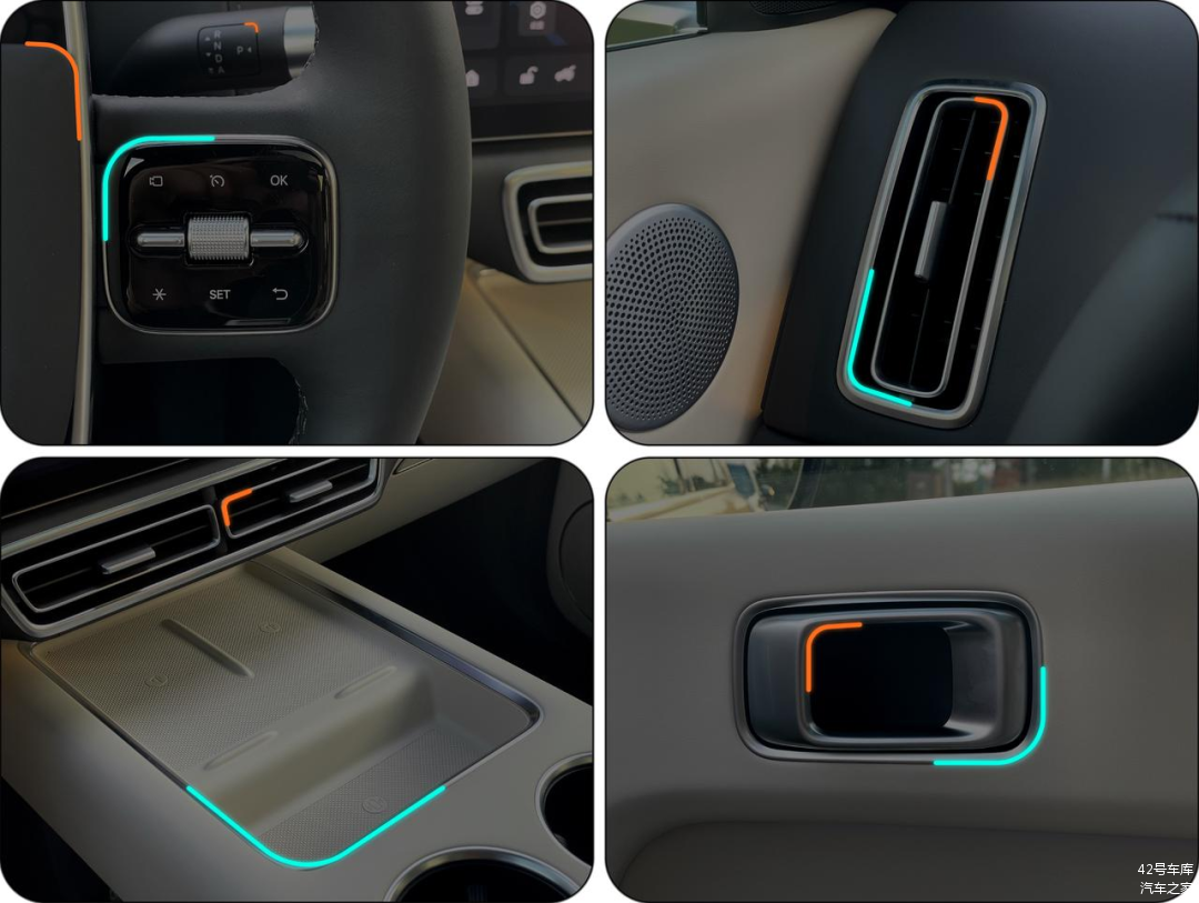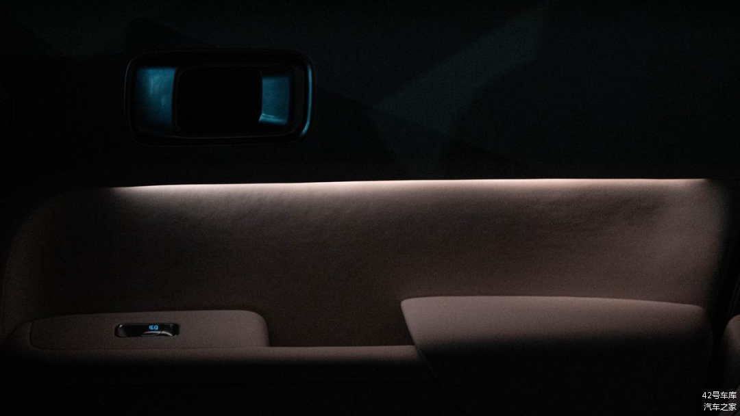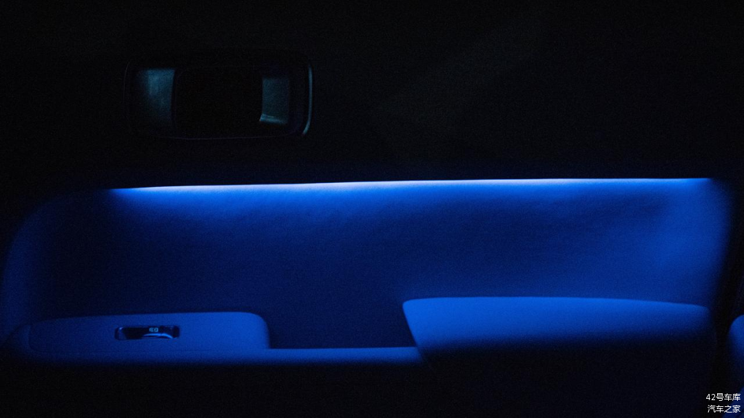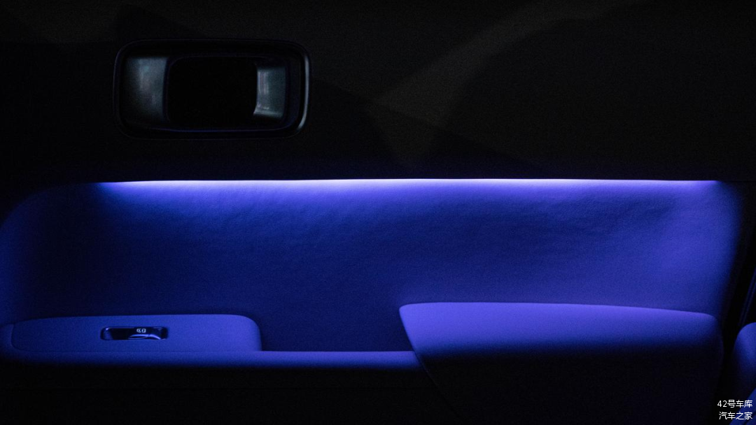 从前排的氛围灯图片可以明显看到,L8 的氛围灯主要为门板、脚部空间提供照明。同时投影的方式并不会让氛围灯与设计相斥,相反通过门板整块 Nappa 的包覆,氛围灯点缀效果会形成非常柔和的渐变过渡。