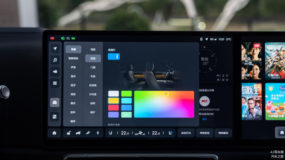 理想 L8 使用的是 256 色的氛围灯设计,用户可以在「车辆—灯光界面」界面的色盘上任意调整灯光颜色。