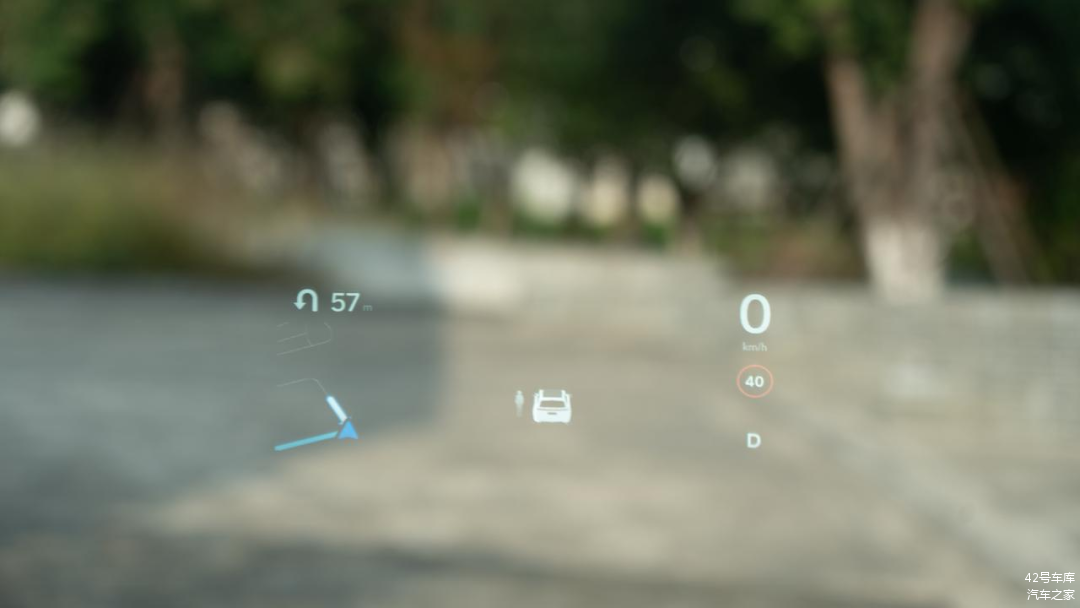 这块 13.35 英寸的 HUD 在驻车时,只会显示档位信息。在开启导航并且挂入 D 档后,可以看到 HUD 左侧显示的是简化后的导航信息。