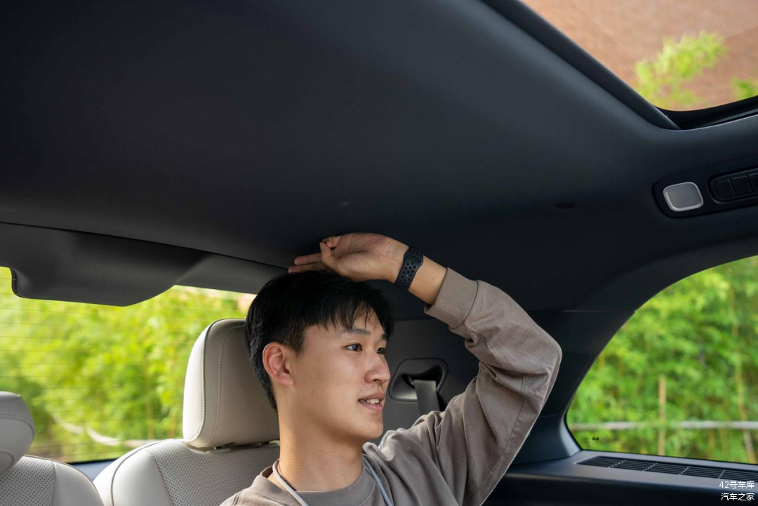 我们的测试员@姜小黑 身高 175 cm,体重 68 kg。在 L8 第一排调整到合适的驾驶位置后,这是姜小黑在 L8 二排比较舒适的座椅设置下,头顶到天幕的距离超过了一掌,相对来说比较富余。