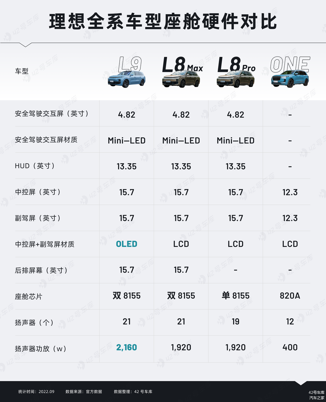 实际上,L8 Max 和 L9 在车内的功能性上,确实也没有太大差别。为此,我们特意汇总了一下理想车系的座舱硬件对比表。