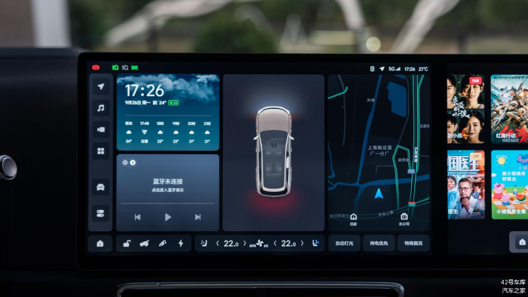 L 型 Dock 栏竖向排列的是常用的功能,在这里可以对常用的功能进行快速切换,横向排布的是空调、驾驶模式等车辆相关设置;顶部显示的是基础的时间、网络等信息。