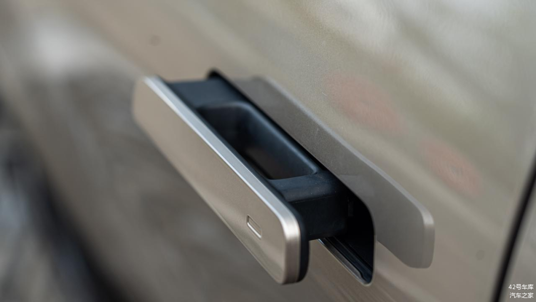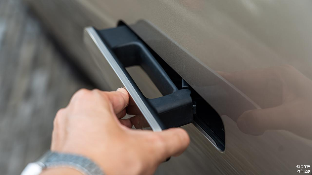 当然,这个门把手同样支持机械开启,像图中这样在主驾门把手弹开的基础上继续拉开,便可以把机械钥匙插进去打开车门了,这个功能主要是在断电的时候使用的。