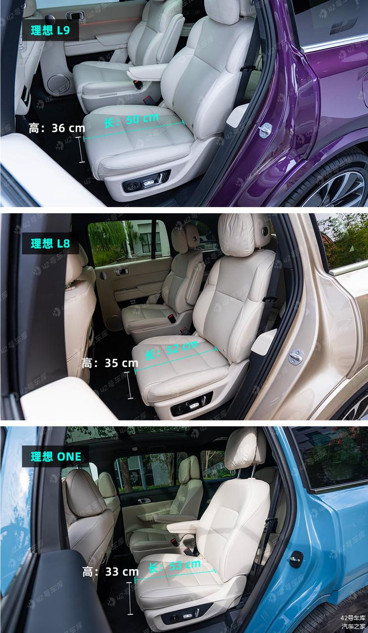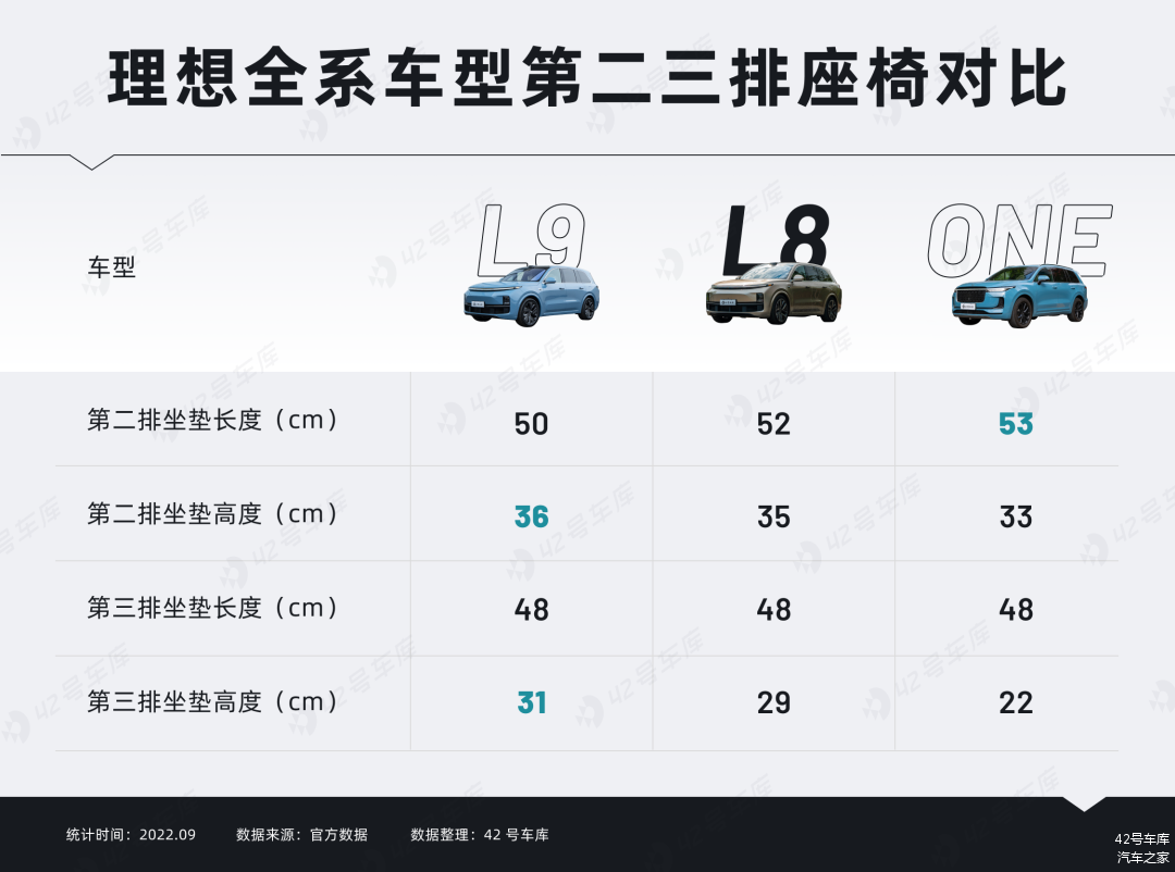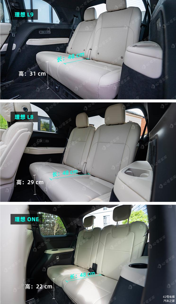 我们测量了 L8、L9、ONE 的二三排座椅数据,可以看到 L8 在高度增加后,相比于 ONE 在第二三排座椅高度上都有优势,坐垫长度差异不大。