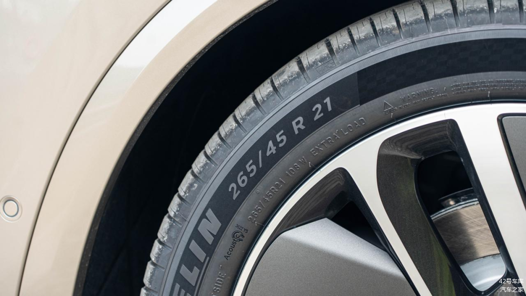 21 寸的轮毂配的是米其林的 PS4 SUV 轮胎,规格为 265/45 R21。这是特调的带静音海绵的版本,无静音海绵的版本售价在 2,000 元左右。