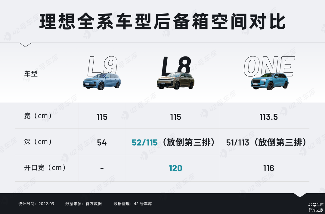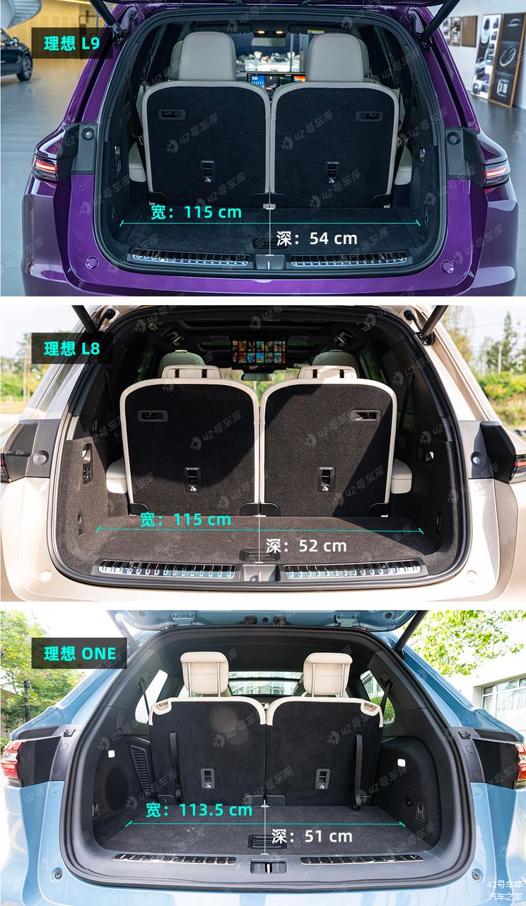 我们进一步比较 L8 与 L9 和 ONE 的尾箱空间,会发现 L8 与 L9 在宽度和深度方面差异不大。