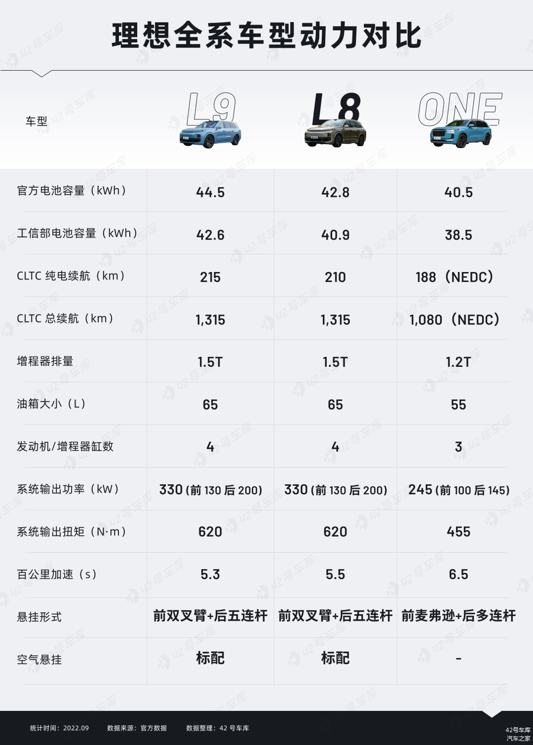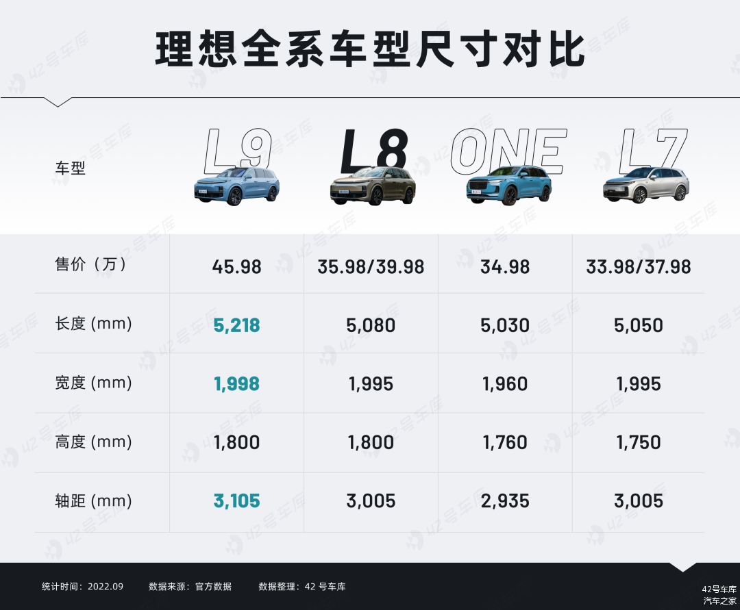 L8 与 L9 在宽度上保持高度一致的原因应该是 X 平台横置的 4 缸增程器总成以及双叉臂悬挂结构对于空间要求更高,这一点在 L7 的参数上其实也能得到印证。