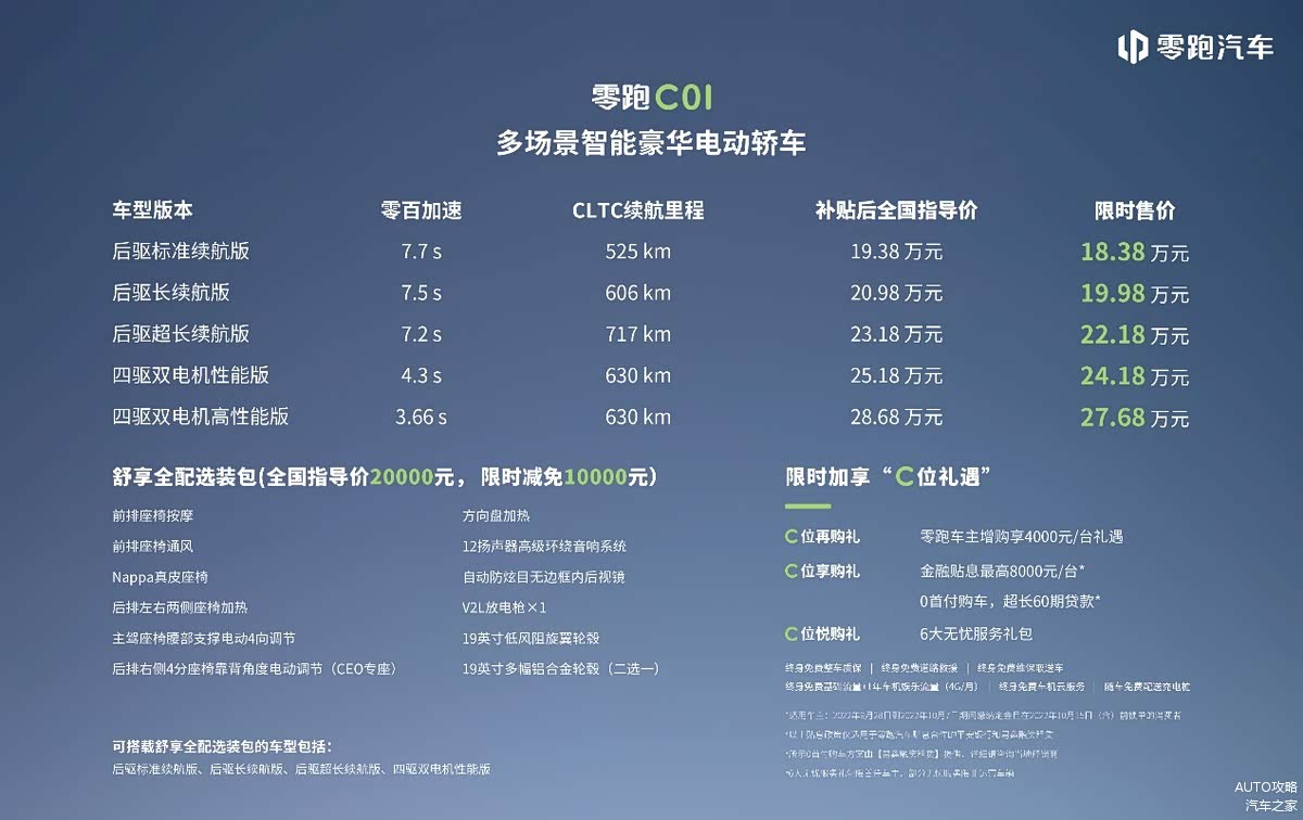 值得注意的是,零跑汽车此次还针对零跑C01推出了限时惊喜礼遇,最高可享20000元限时减免,含整车减免10000元,舒享全配选装包减免10000元,售价低至18.38万起。