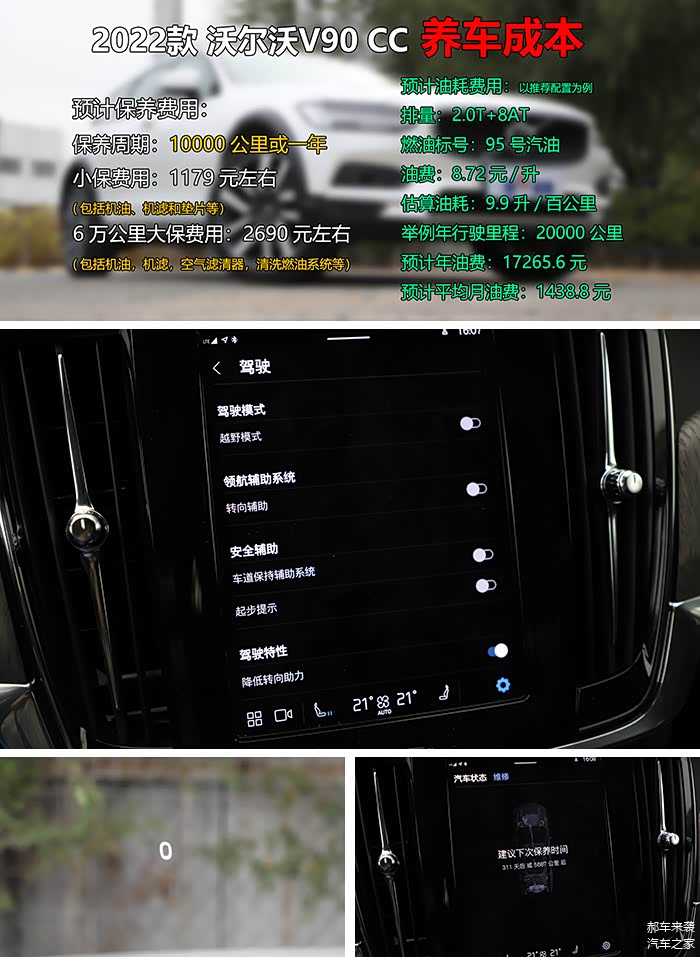俗话说,买车容易养车难,那么在极具诱惑力的售价背后,沃尔沃V90 CC的养车成本又如何呢?保养方面,新车保养周期为10000公里或一年,小保养费用1179元左右,6万公里大保养费用约为2690元,对于一款纯进口豪华品牌来说,这个费用也算在意料之中了。油耗方面,前面提到过综合油耗显示为7.9升/百公里,为了更接近真实,郝哥以再增加两个油计算,也就是9.9升,目前北京地区95号汽油的油价为8.72元/升,假如每年行驶20000公里,那么预计您的年油费为17265.6元,平均月油费为1438.8元,不知道这样的油耗水平您还满意么?