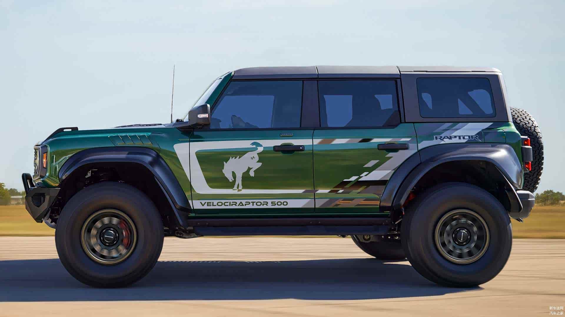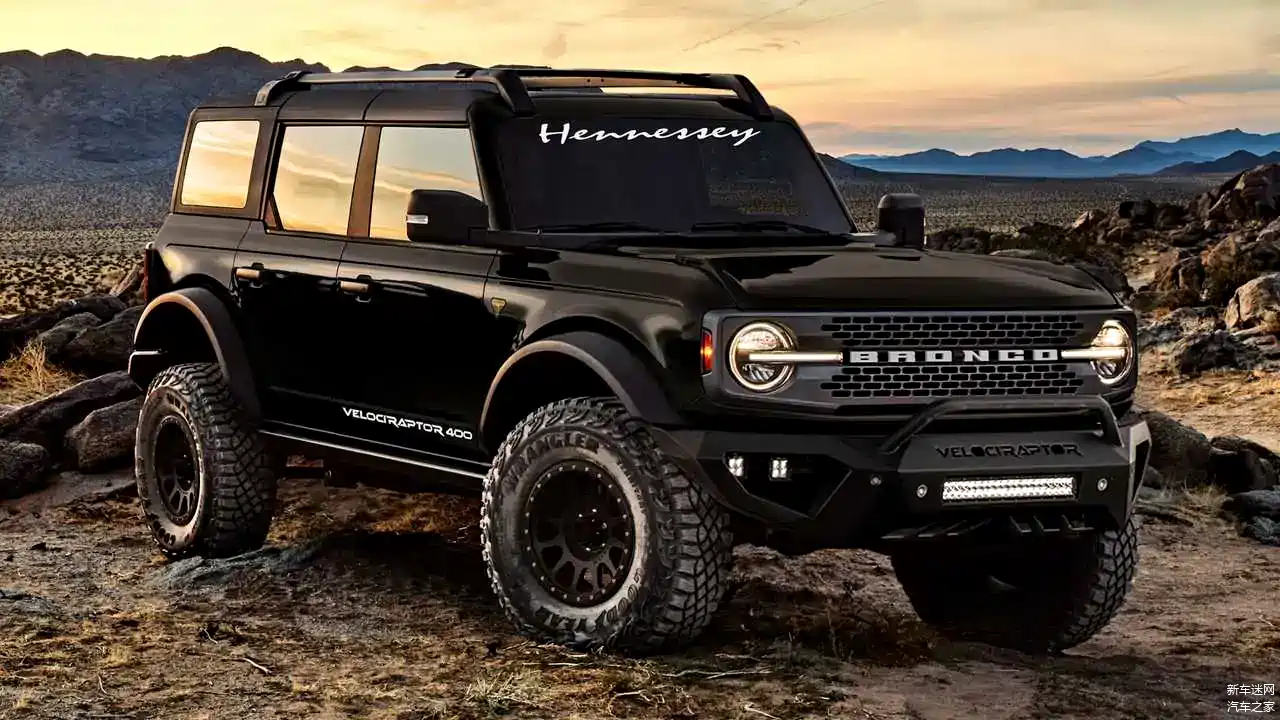 这是Hennessey推出的第8款迅猛龙车型,也是Bronco的第二款车型。该公司去年推出了VelociRaptor 400 Bronco,将这款SUV的2.7升EcoBoost发动机提高到411马力(306千瓦)和603磅英尺(818牛·米)扭矩,与新车型相比,还进行了一系列外观升级。