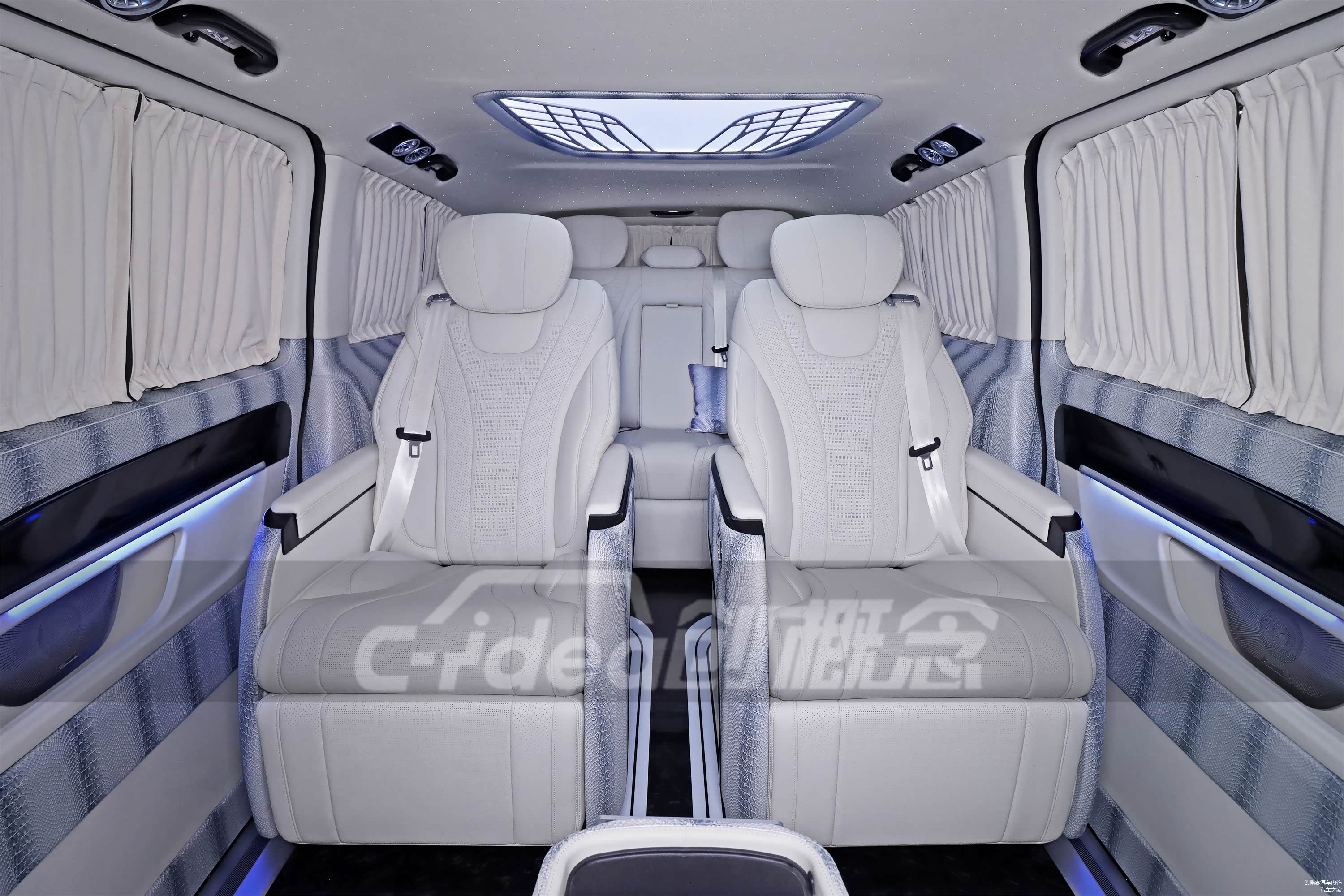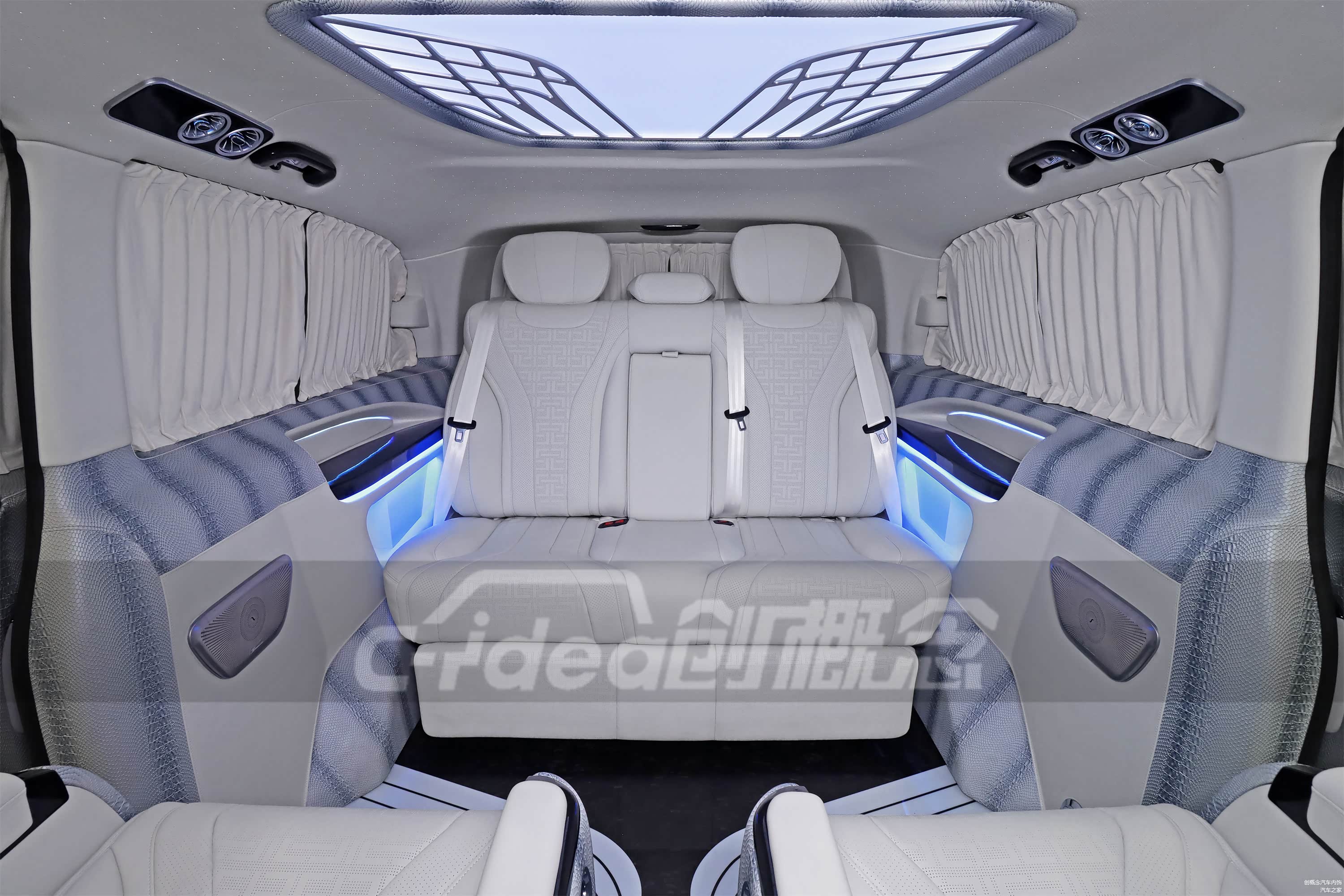 后排沙发座椅可以平放变成一张沙发床,也能三座变两座,多功能扶手盒自带杯托设计,储物方便,实用美观。顶棚包覆米白色行云流水反毛皮,安装新款小迈巴赫顶灯与满天星星空灯,定制七彩氛围灯,还可以多种颜色切换,启动变色模式,营造浪漫氛围。