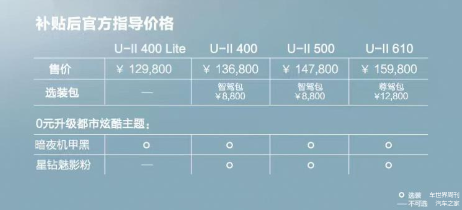 哪吒U-Ⅱ全系共推出4款配置,其中400Lite、400、500系列车型分别匹配有三元锂和磷酸铁锂电池组,为了方便对比我们进行合并解析。新车针对配置部分,除了前文提到的主要变化外,不同版本之间也有一些差异。综合来看,400和500版本的性价比相对来说还是不错的,如果预算尚可,还可选装8800元的智驾包,能够带来更高阶的驾驶体验。