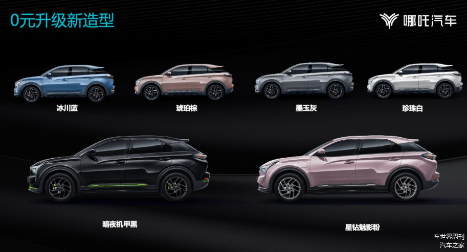 其中,哪吒U-Ⅱ暗夜机甲黑主题车身全面黑化处理,并辅以绿色的装饰条,犹如一个暗夜精灵;而星钻魅影粉主题则比较符合女性消费者的审美需求,不仅外观采用了粉色涂装,内饰也有了更多的新意。
