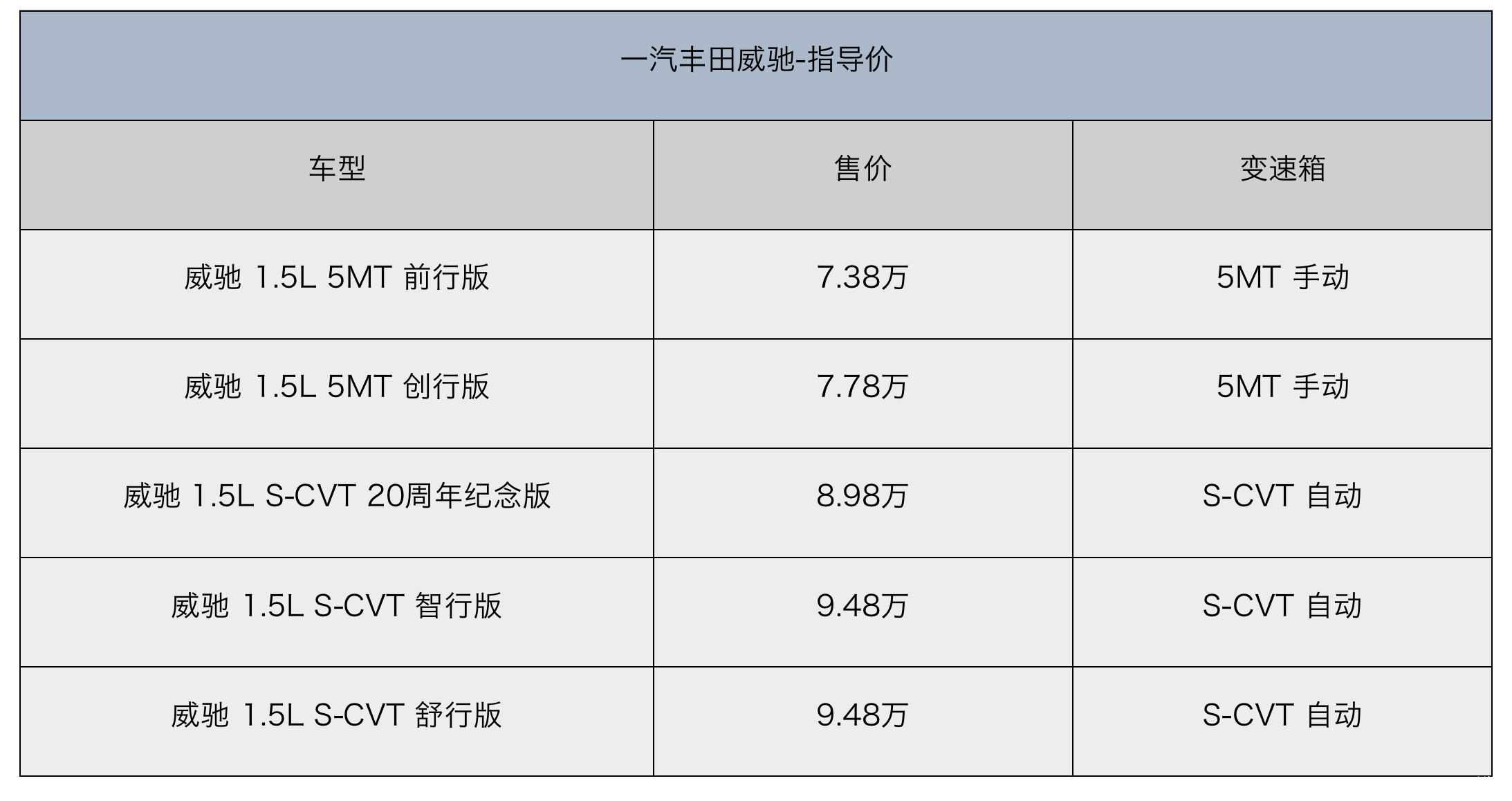 配置方面,以三厢版的威驰为例,目前威驰共5款在售车型,售价范围是7.38-9.48万元。其中,2款为匹配5MT变速箱的手动挡车型、3款为匹配CVT变速箱的自动挡车型。