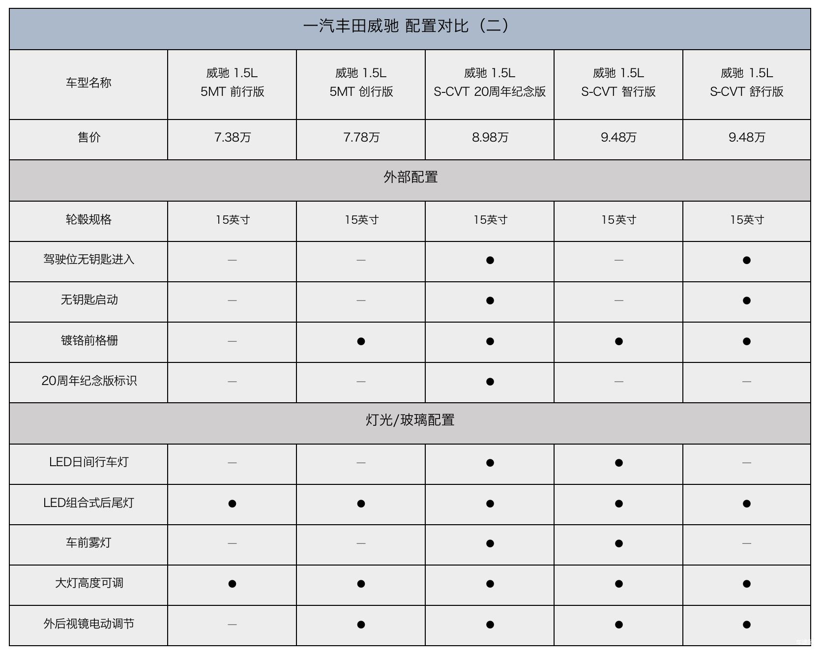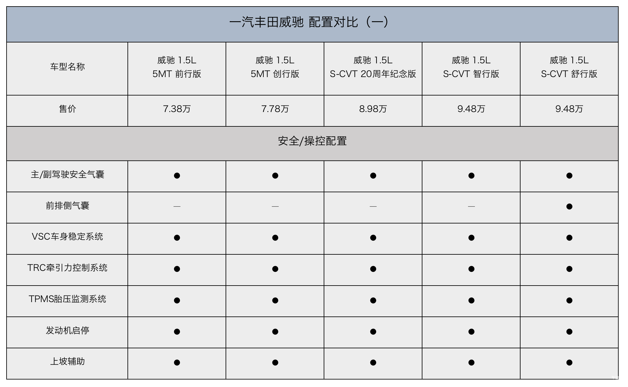 在三厢版威驰的全系5款配置中,20周年纪念版是一汽丰田在此前创行版车型的基础上进行了显著增配后所推出的新车型,通过对比不难发现,它是目前5款车型中性价比最高的车型之一,那么,我们接下来就不妨通过解读配置表,来看看它在安全、驾驶、外观、内饰等方面的配置情况究竟如何。