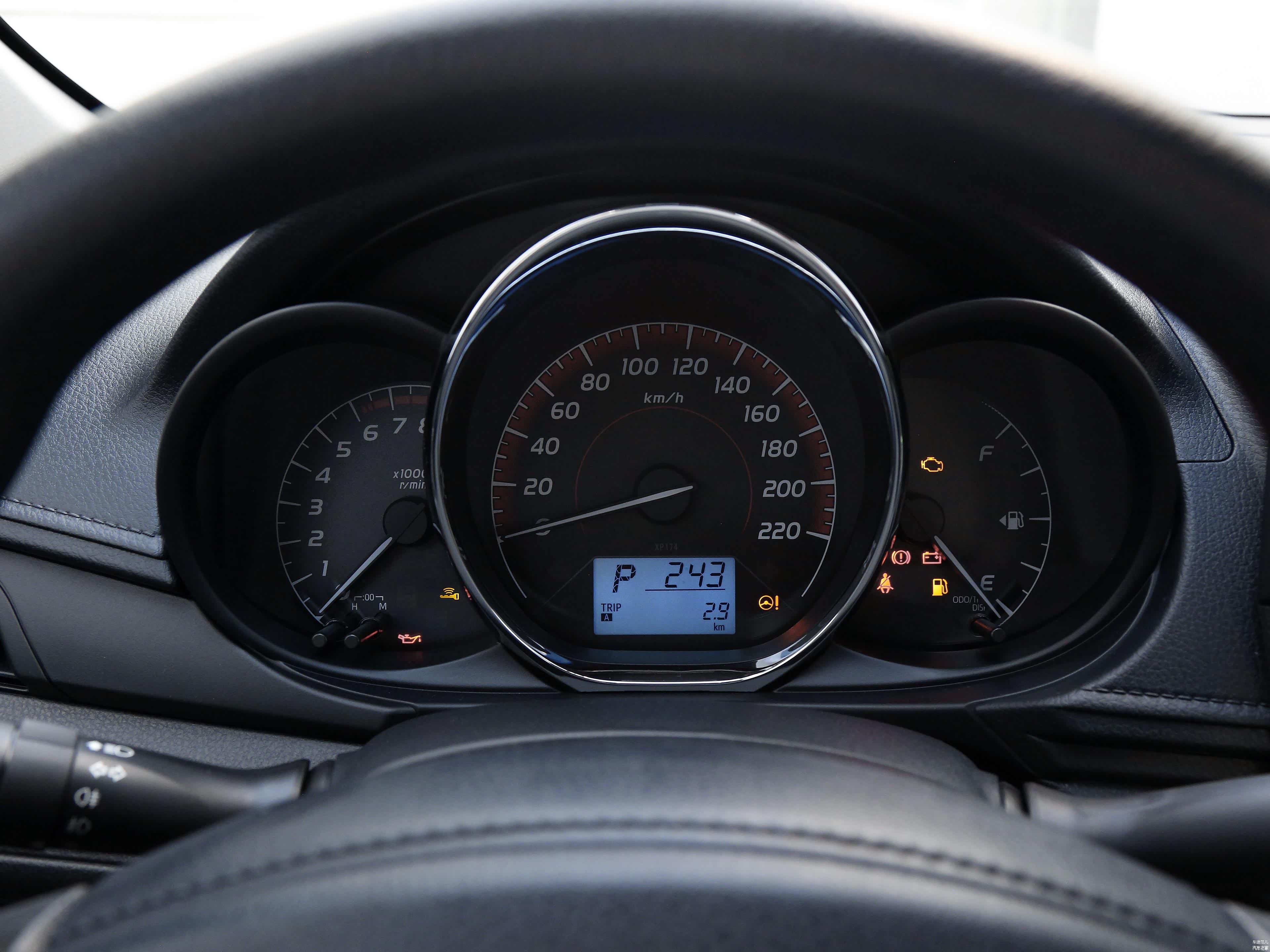 威驰仪表盘的造型颇为简约,三炮筒的设计将各个信息显示区域划分得清晰明了,当然,中央最醒目的炮筒提供的是行车时速和挡位信息,读取起来十分直观。