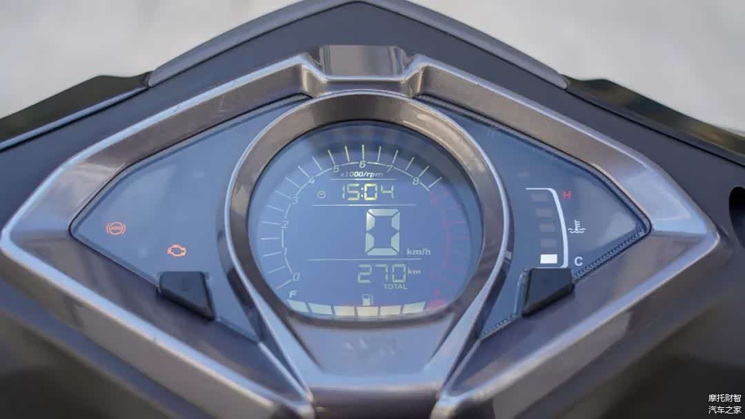 仪表由一块圆形液晶仪表加两侧类三角形的指示灯区域组合而成,仪表可根据外界光线自动调节亮度,大晴天同样能有不错的可视度;功能性上具备独立的转速表以及水温表,更让我惊喜的是在左侧指示灯区域除了常见的发动机故障、ABS工作状态等指示灯以外,JET SL还具备侧踢指示灯。手把开关则是我们在踏板车上常见的组合,自带双闪功能。