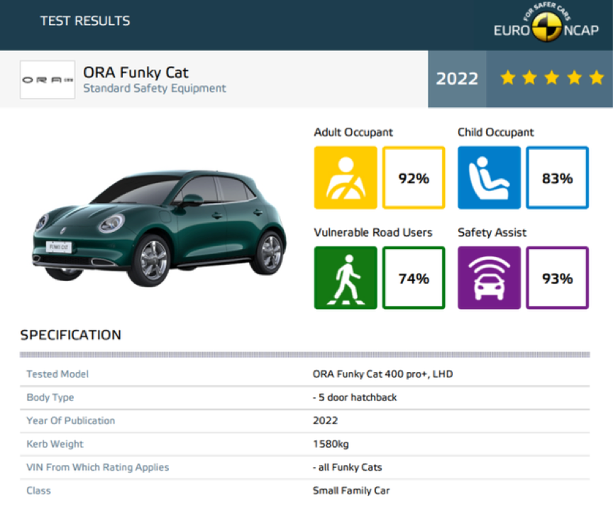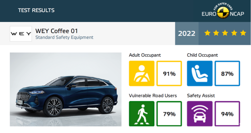 比如,早在今年1月,在1月,摩卡PHEV(Coffee 01)就已完成WVTA欧盟整车型式认证,符合严苛的欧6d排放标准。同时在E-NCAP安全碰撞测试中成人乘员、儿童乘员、弱势道路使用者、安全辅助四个单项得分率分别为91%、87%、79%、94%,均获五星安全评级。