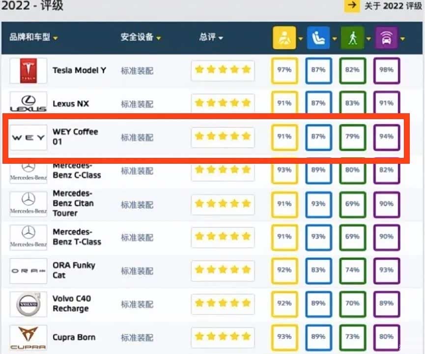 而且摩卡PHEV(Coffee 01)以全面的高分数位列2022综合评分第三名,安全性优于奔驰、沃尔沃等欧洲传统豪华品牌车型。
