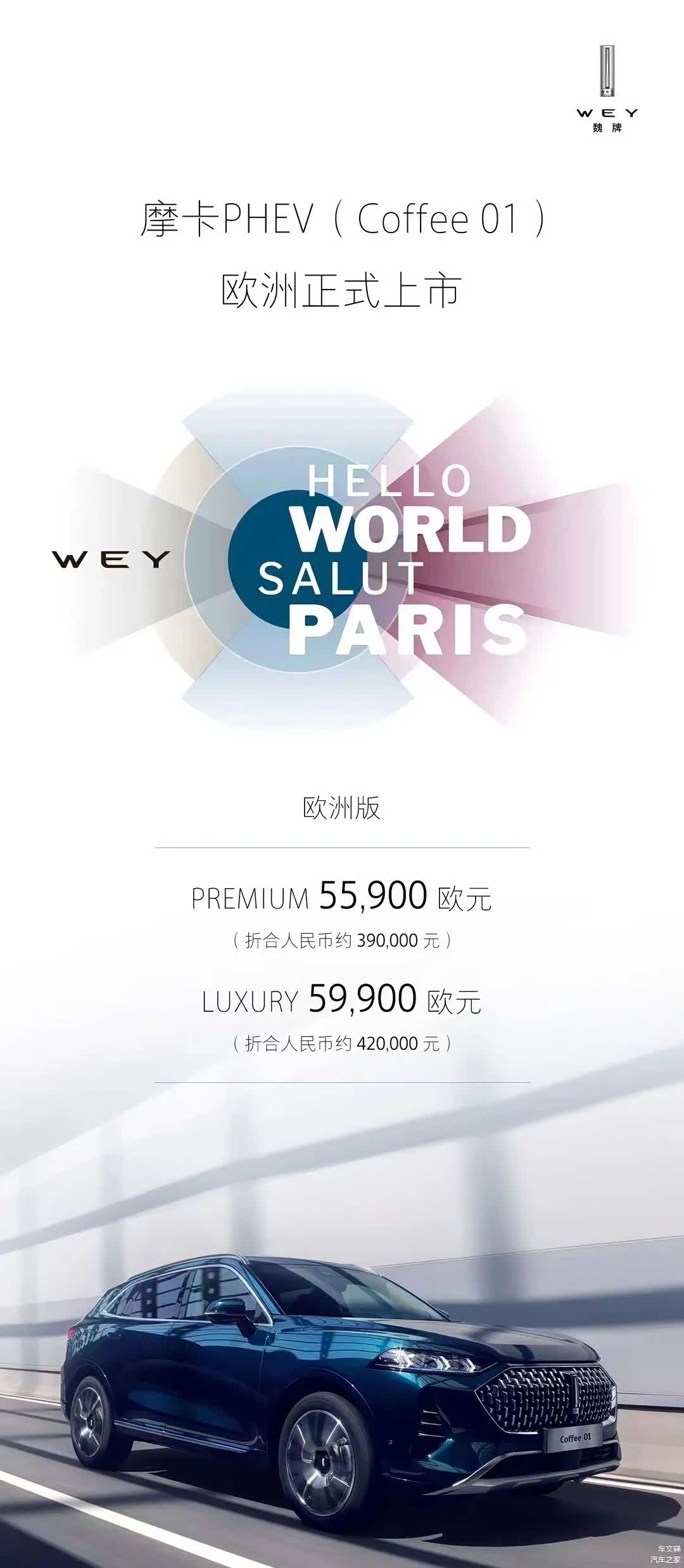 2017年法兰克福车展也拉开了魏牌进军欧洲市场的序幕;2019年法兰克福车展、2021年慕尼黑车展均有魏牌的身影。10月17日,巴黎车展开幕,魏牌谋划多年的进军欧洲计划正式落地——魏牌摩卡PHEV(Coffee 01)上市——共两款车型,售价为5.59万欧元和5.99万欧元(约合人民币为39万元和42万元)。