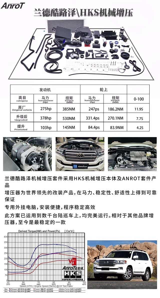 陆巡4.0在进行HKS机械增压套件改装后,原车最大马力由275匹提升至378匹马力,原车最大扭矩由385牛米提升至530牛米,改装后动力媲美5700。改装后陆巡具备更强大的动力输出,能适应各种越野路况。动力升级车改俱乐部专注动力提升,服务于大型越野车普拉多2700、穿越者2700、途乐4.0、兰德酷路泽4.0……