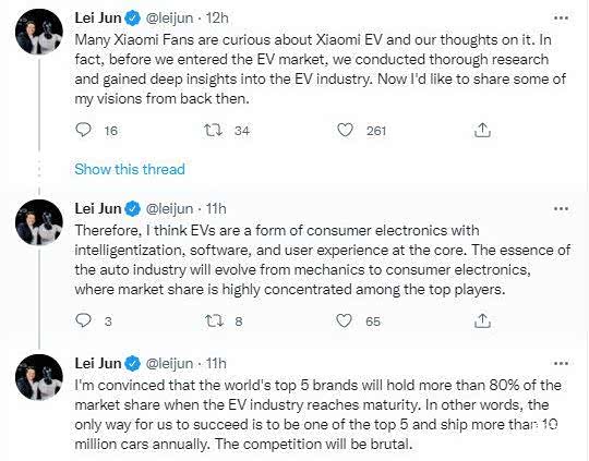 雷军表示,汽车行业的本质将从机械演变为消费电子,市场份额高度集中于顶级玩家手中。雷军还表示,他相信,当电动汽车行业成熟时,世界前五大品牌将占据80%以上的市场份额。他称:“换句话说,我们成功的唯一途径是成为前五名之一,并且每年出货量超过1000万辆。竞争将是残酷的。”