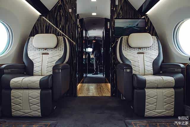 奢华飞机座舱内,湾流G650私人飞机与西科斯基S-76直升机定制座椅的设计灵感,源自Bacalar车身定制车型的亚麻白(Linen)和鲸鱼黑(Beluga)真皮绲边座椅的独特形状和梭织缝线。