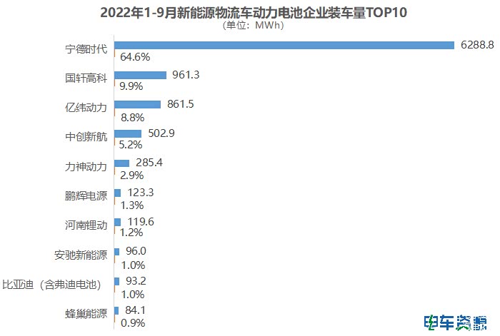 从具体数据来看,2022年1-9月新能源物流车动力电池装车量排名前十位的企业分别是宁德时代、国轩高科、亿纬动力、中创新航、力神动力、鹏辉电源、河南锂动、安驰新能源、比亚迪(含弗迪电池)、蜂巢能源。