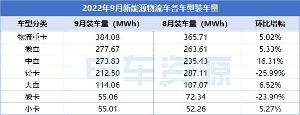 具体到动力电池装车量的表现,9月新能源轻卡电池装车量为212.5MWh,环比减少25.99%;9月微卡电池装车量为55.06MWh,环比下降23.9%。由于中面销量出现大幅增长,其装车量直逼微面车型,环比增长16.31%。