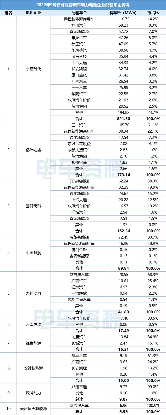 电车资源数据显示,2022年9月新能源物流车动力电池装车量约为1.39GWh,前三名是宁德时代、亿纬锂能、国轩高科。与上月相比,第二、三名位置互换,但装车量相差不大。