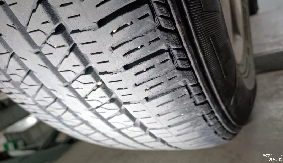 有吃胎迹象,外侧胎边严重偏磨,都老化开裂了;定位数据应该比较混乱。