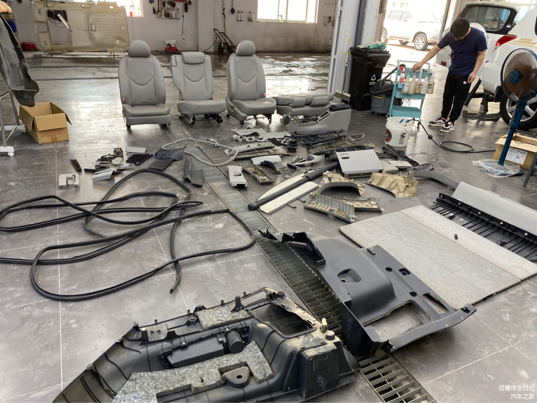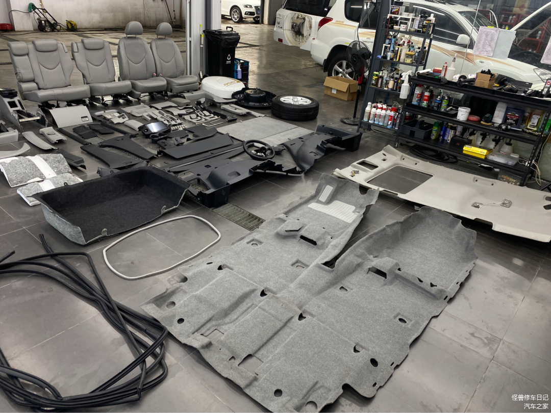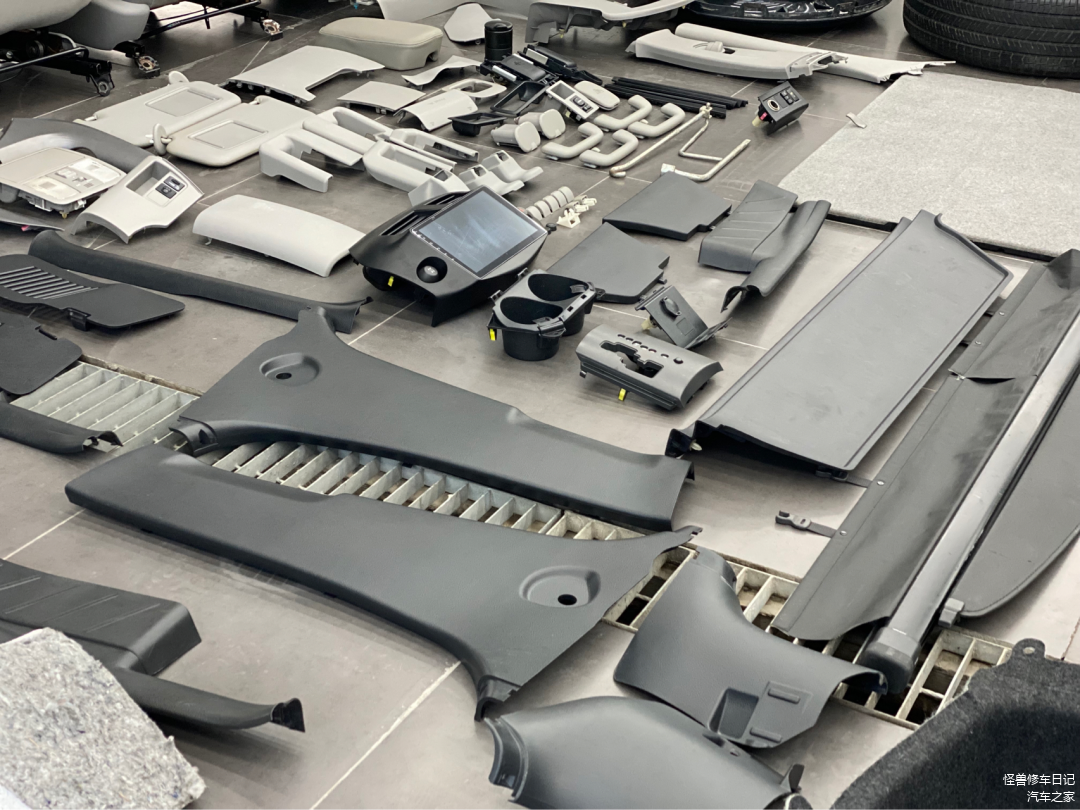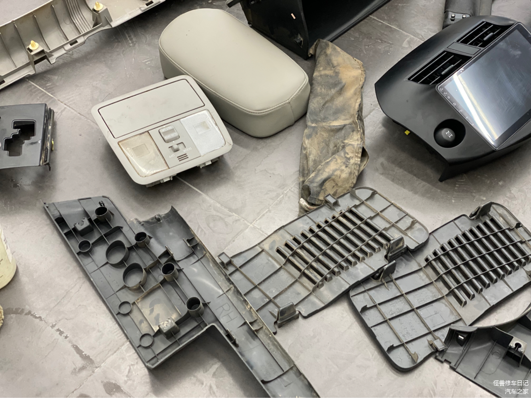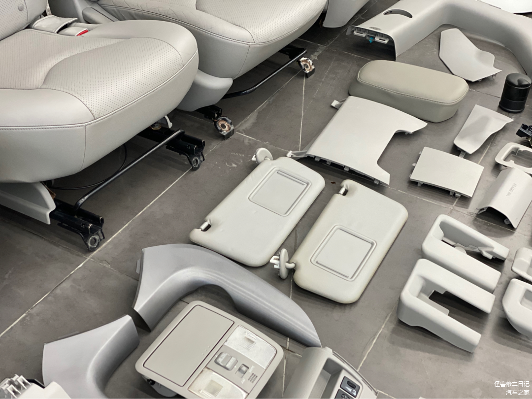 拆的内饰件,摆满了一地,准备清洁大工程。