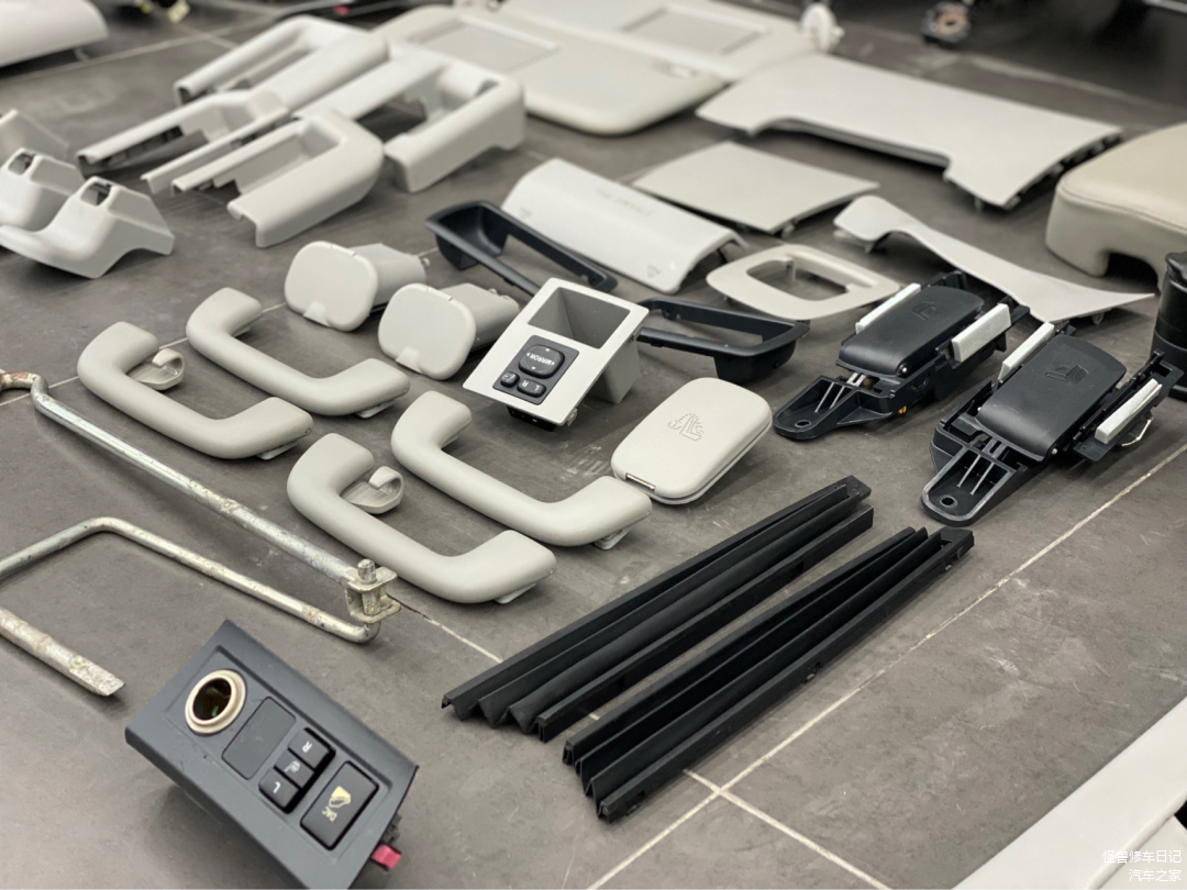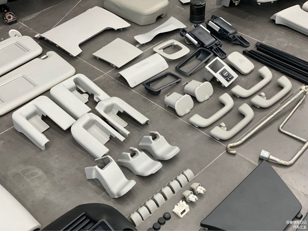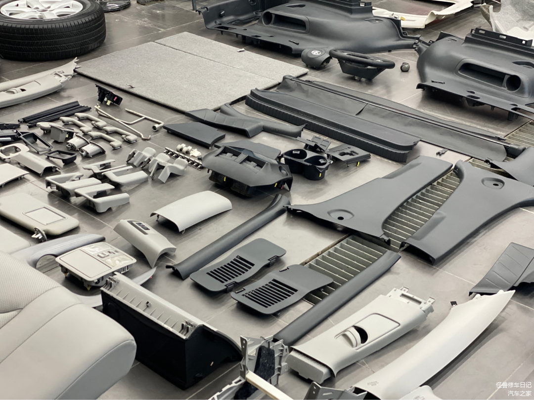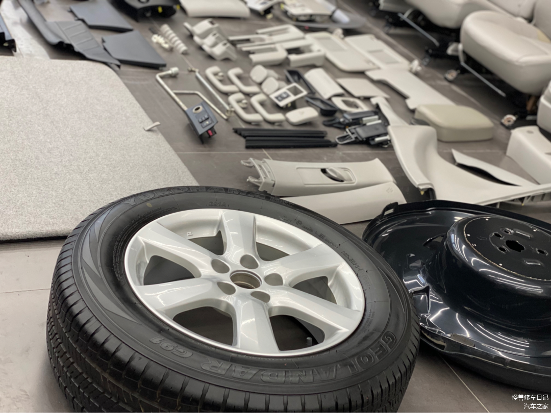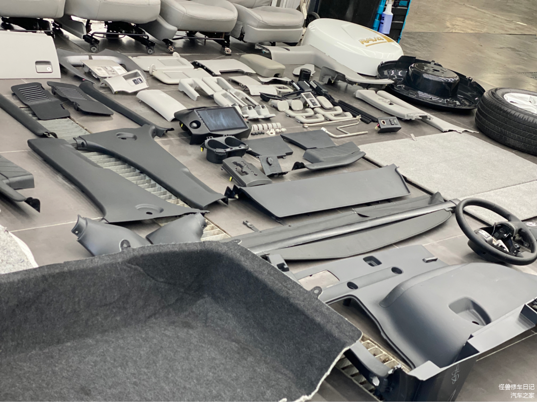 拆的内饰件,摆满了一地,准备清洁大工程。