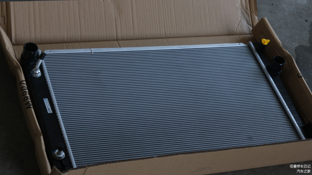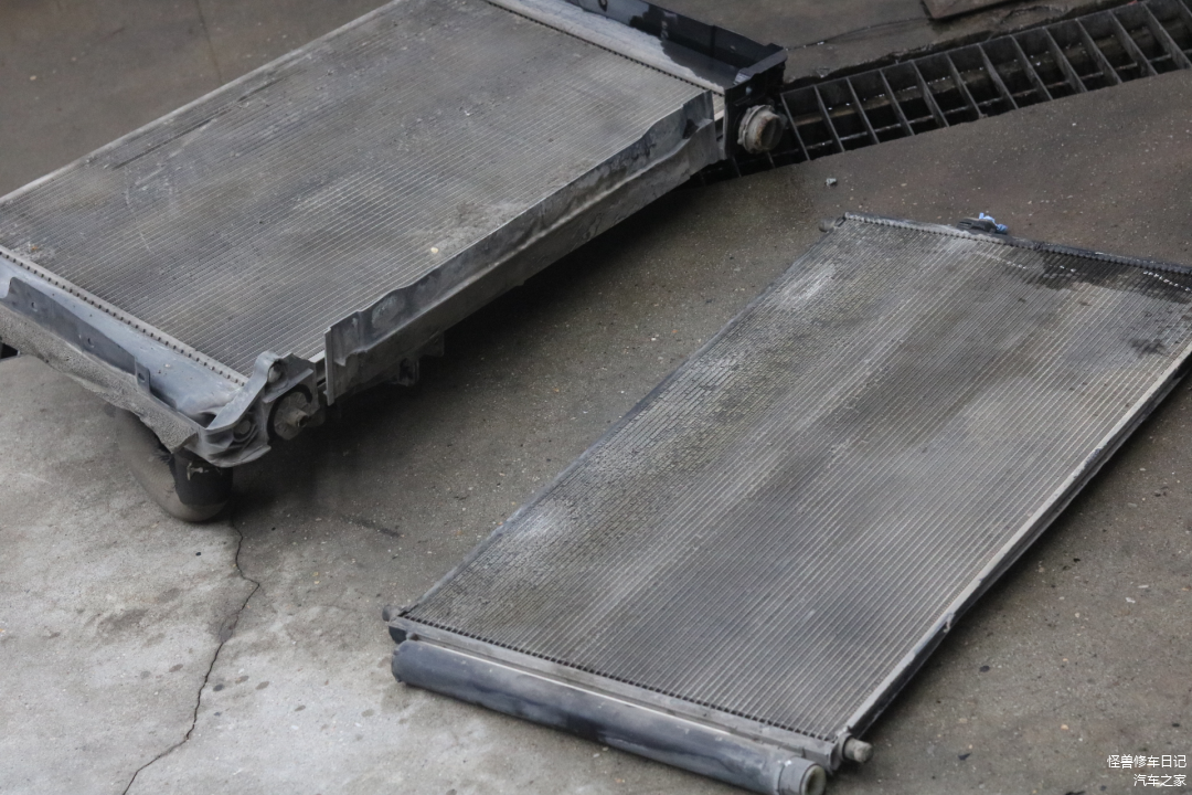 拆洗散热系统,冷凝器和水箱蛮脏了,水箱已经渗漏了,白点处有沙眼。