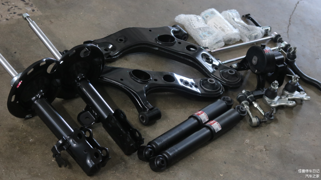开搞底盘系统了,前悬挂部件更新,为了提升这辆车的整体行驶质感和舒适性,选择升级一套日本KYB避震,更换一组原厂下摆臂+拉杆+球头+发动机支架等。