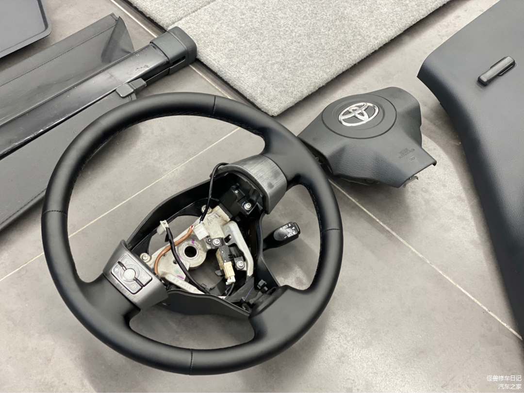 开拆内饰了,方向盘拆除做一下翻新。不知道哪任车主改的中控大屏,属实有点抢眼,严损经典啊!