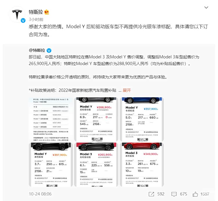 在24日,特斯拉宣布下调中国大陆地区在售的Model 3和Model Y车型的售价,其中ModelY后轮驱动版还免费提供“冷光银”车漆。而在短短的3天之后,特斯拉就宣布“冷光银”车漆再度收费。