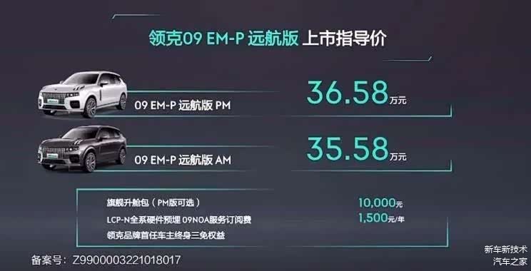 这次领克09 EM-P共推出了四款车型,售价区间为35.58-36.58万元,分别为远航版AM和远航版PM,这两个版本又分6座和7座版,才有了四个版本。