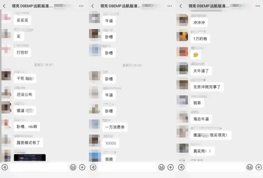 就在公布售价的一瞬间,领克09 EM-P准车主微信群里突然沸腾了。这让无论是前期坚定买09 EM-P还是在09 EM-P和理想L8之间摇摆的车主瞬间爆炸了,一时间,微信群里全是“买买买”、“冲冲冲”。