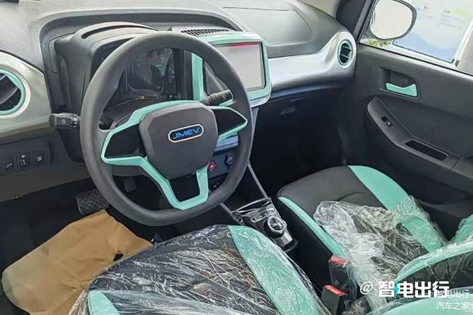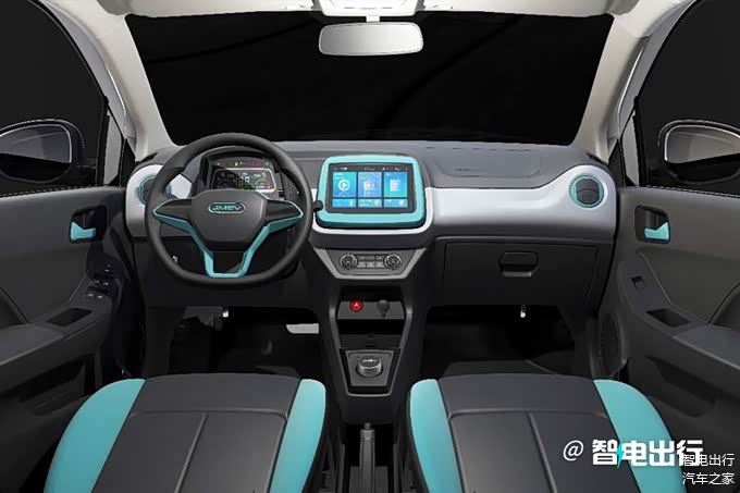 江铃EV2车内采用纵横双色拼接内饰,配备三幅式方向盘、液晶仪表、内嵌式中控屏、圆形空调出风口、空调功能调节面板和旋钮式换挡机构等。新车座椅采用织物面料包裹,同时后排座椅支持整体放倒功能,具有一定的空间扩展性。