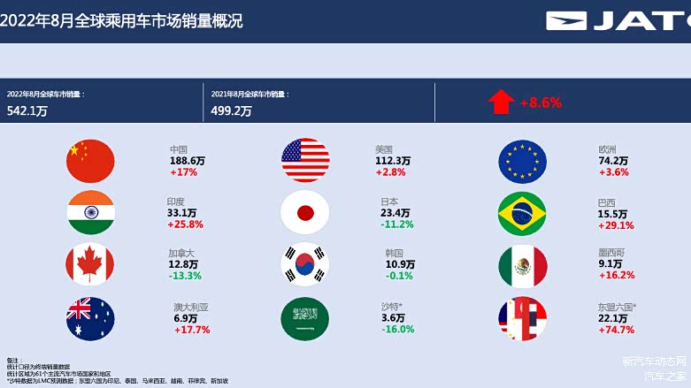 8月全球乘用车市场终端销量达542.1万辆,同比增长8.6%,其中中国、美国、欧洲、印度和巴西市场为主要增长市场;1-8月全球乘用车市场终端累计销量为4223万辆,受芯片短缺和需求疲软影响同比依旧下滑,下滑幅度为38%。